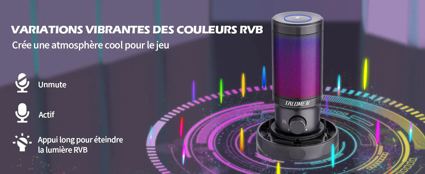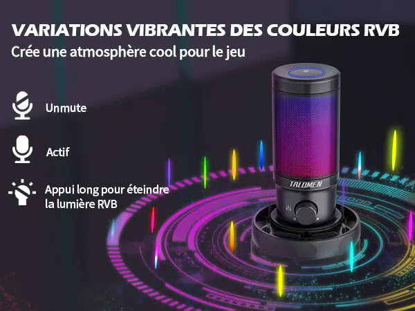 Le dégradé automatique RVB bicolore fait de votre microphone la cerise sur le gâteau. Avec des effets d'éclairage doux et coordonnés, votre vidéo de jeu ou votre diffusion en direct sera plus accrocheuse. Faites en sorte que votre chaîne se démarque du classement. Si vous n'êtes qu'un joueur, la riche correspondance RVB avec vos accessoires informatiques aux couleurs fluides peut répondre aux besoins d'une atmosphère de jeu plus intense.