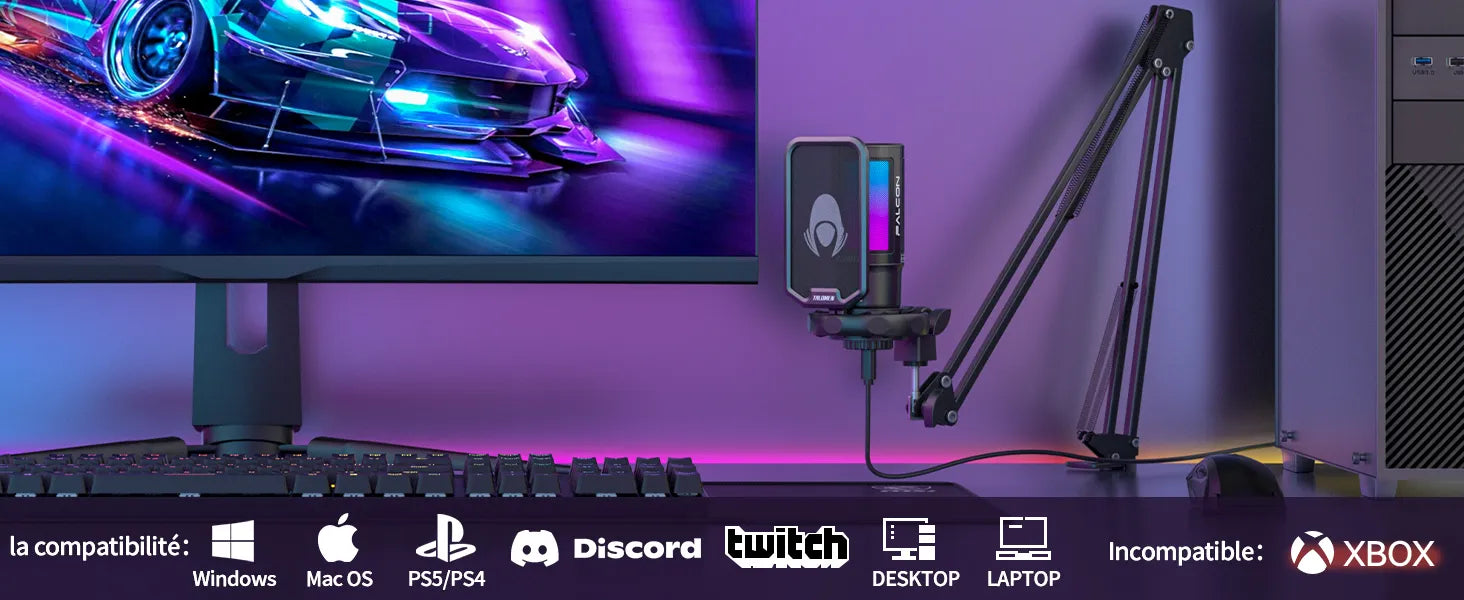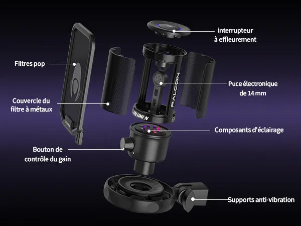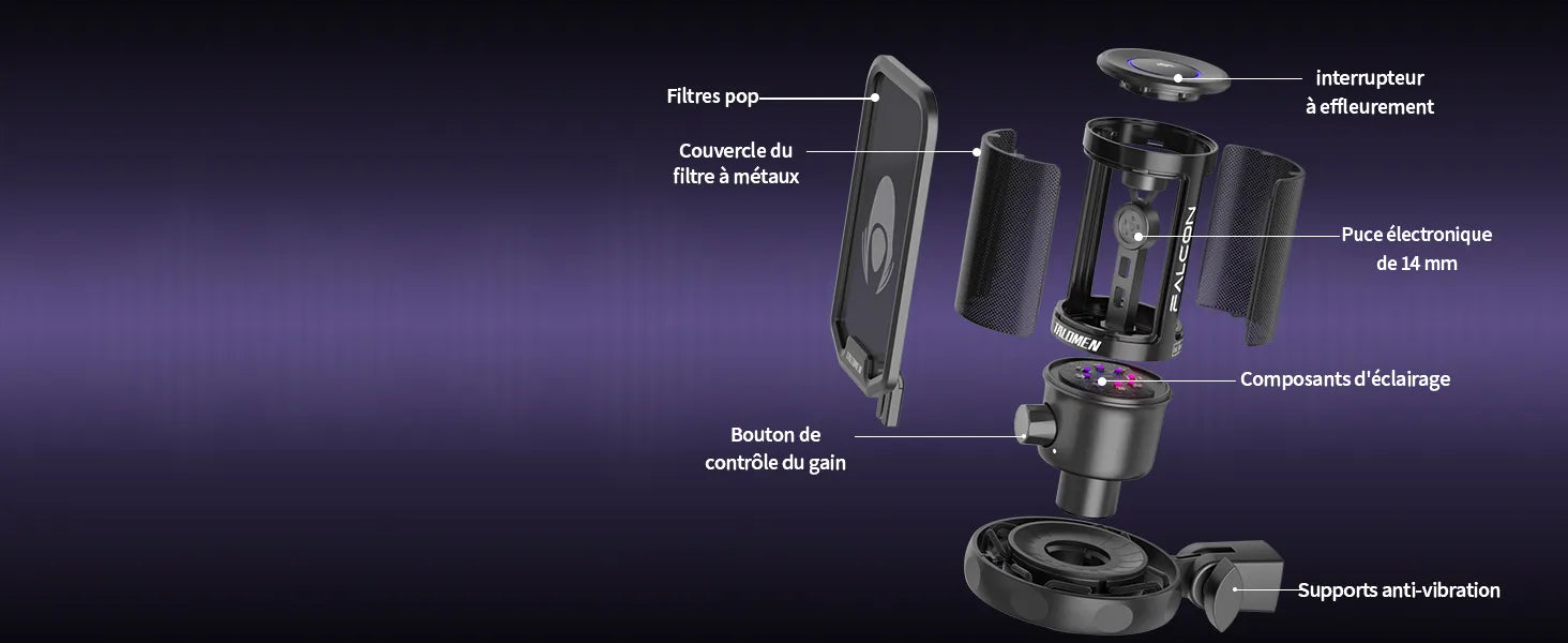 Ensemble de microphone USB pour PC de jeu Falcon Stand Le paquet comprend 1 support antichoc * 1, 1 filtre anti-pop * 1, un support de bras de flèche avec adaptateur * 1, un casque jack 3,5 mm haute sensibilité * 1, un câble USB de 6,5' (2 m) * 1, une pince en C * 1 et un manuel d'utilisation Comprend * 1. 2) Le support de microphone RVB se fixe solidement aux bureaux jusqu'à 2 pouces d'épaisseur.