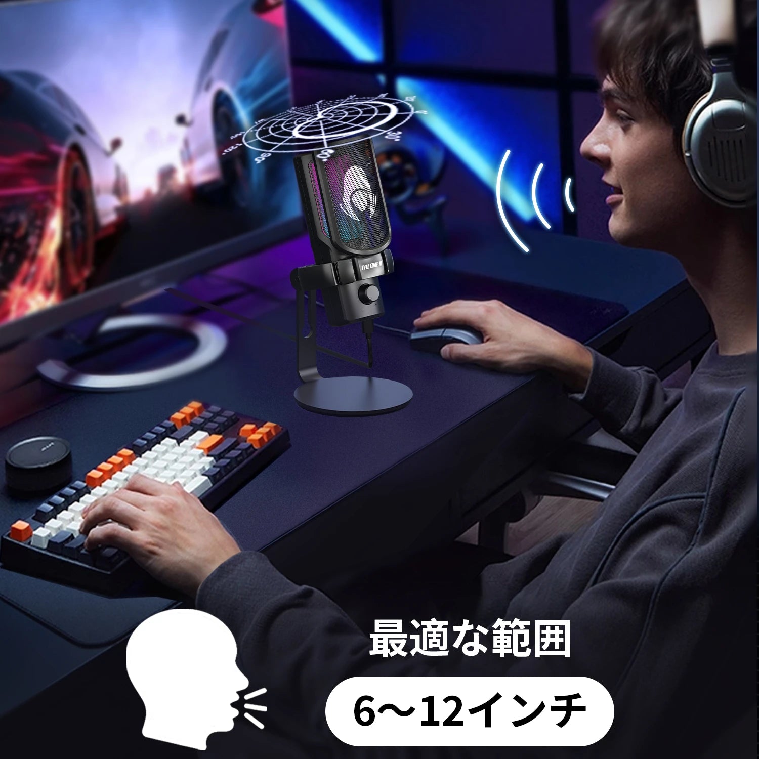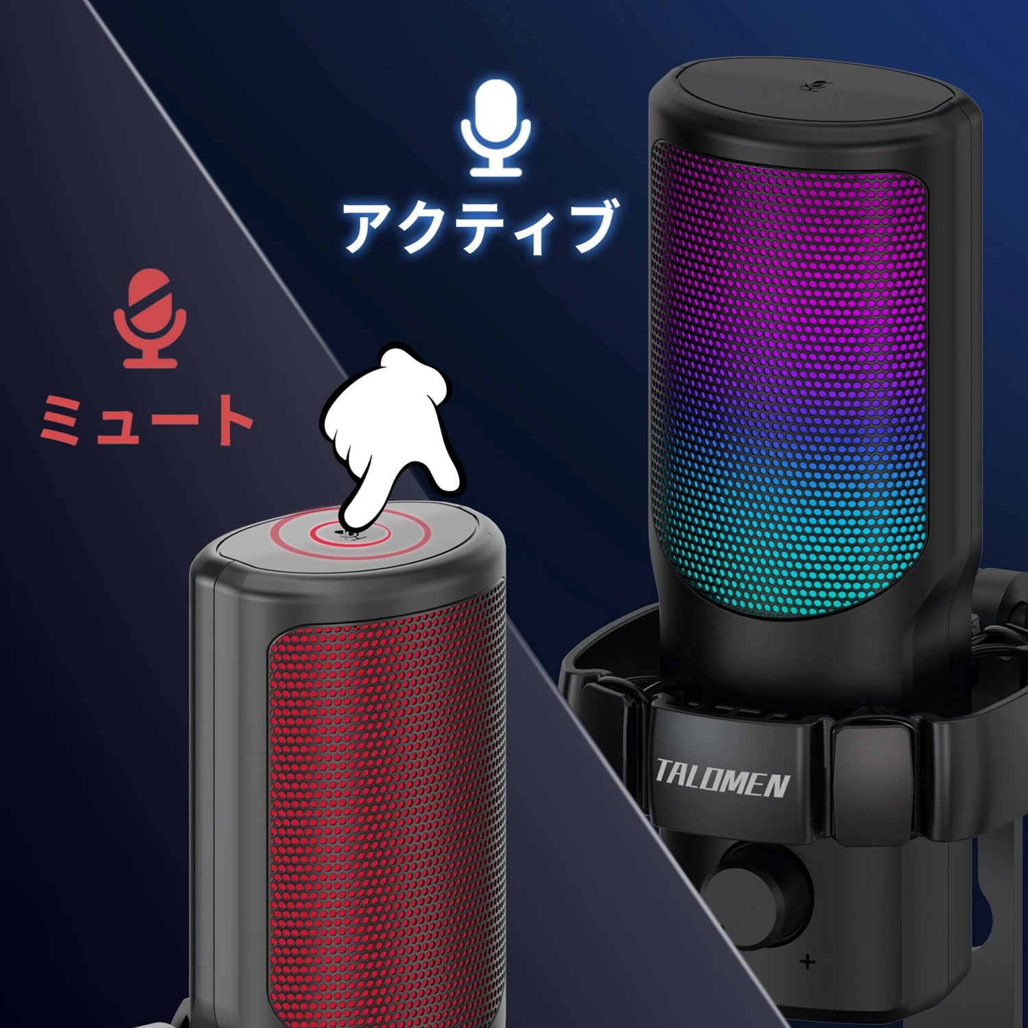 Talomen USB ゲーミング マイクは、7 つのカラー モードを備えた鮮やかな RGB 照明を備え、臨場感あふれるゲーム環境を作り出します。このスタジオ マイク ゲーミングには、タッチ センシティブ クイック ミュート機能が搭載されています。タップするだけでマイクがミュートされるため、ミュートされたことが常にわかり、ストリーミングやゲーム中に予期しない中断が発生するのを防ぐことができます。