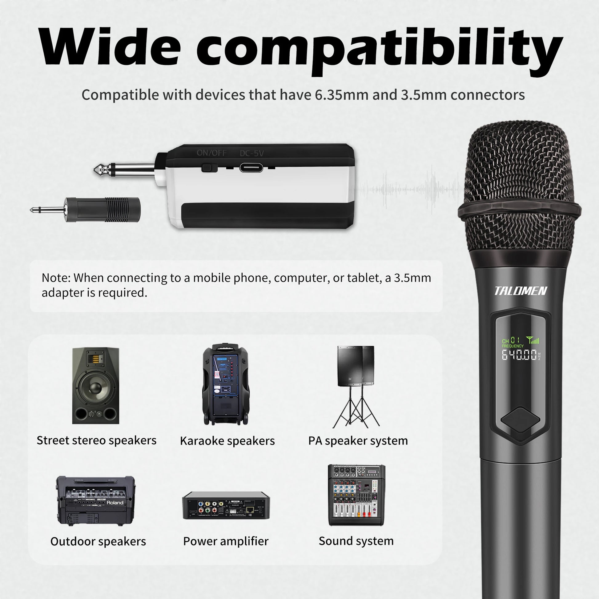 Designed for input devices with 6.35 mm (1/4 inch) or 3.5 mm (1/8 inch) microphone connectors, such as party speakers, karaoke speakers, audio amplifiers, pa systems, audio interfaces, truck speaker systems, dome speaker systems, mixers, amplifiers, and more. Please note that it does not support connection with devices such as Bluetooth speakers, laptops, cell phones, computers, smart TVs or tablets.